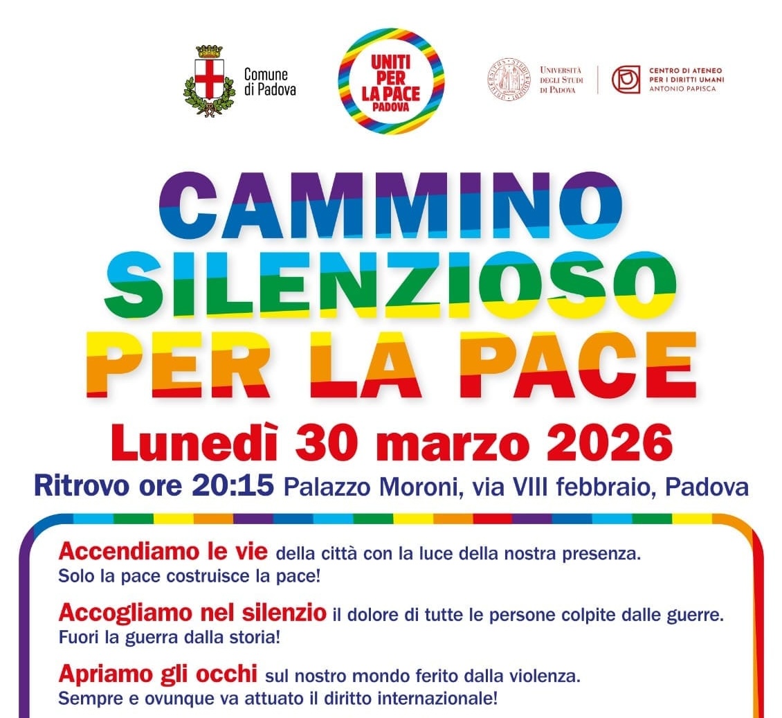 Noi Padova aderisce all’invito del “Cammino silenzioso per la Pace”, in programma per lunedì 30 marzo 2026 con ritrovo alle ore 20:15 a Palazzo Moroni a Padova. Si marcerà in silenzio fino a Prato della Valle portando con sè una torcia led o un cellulare per portare luce durante il passaggio nelle vie.