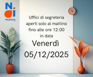 NOI Padova comunica che in data venerdì 5 dicembre 2025 gli uffici di segreteria rimarranno aperti soltanto al mattino fino alle ore 12:00. Lunedì 8