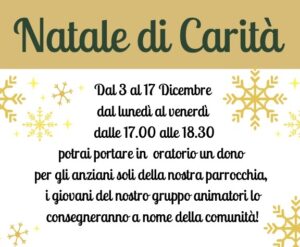 Il circolo Noi S. Giovanni Bosco propone un Natale di Carità. Dal 3 al 17 dicembre dalle ore 17:00 alle 18:30 sarà possibile portare in