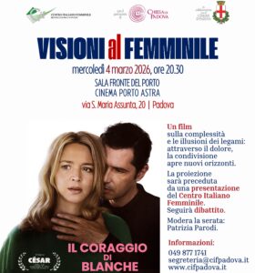 NOI Padova informa che il Centro Italiano Femminile, in occasione dell’imminente festa della donna, propone per mercoledì 4 marzo alle ore 20:30 un appuntamento al