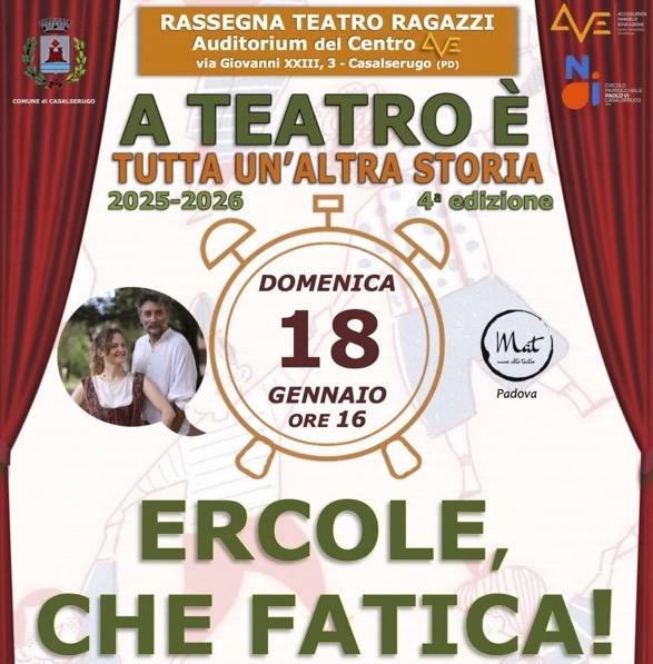 L’appuntamento per l’iniziativa dedicata ai ragazzi sarà domenica 18 gennaio alle ore 16:00 presso il teatro del centro parrocchiale AVE con “Ercole che fatica!”, messo in scena dalla compagnia teatrale “Mat”.