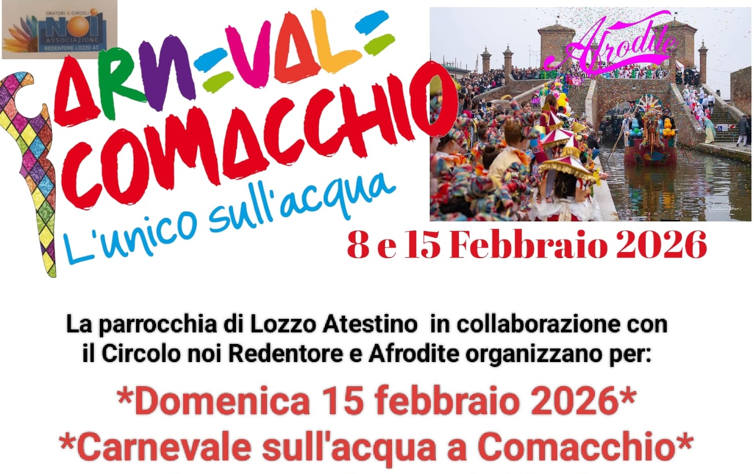Il circolo Noi di Lozzo, in collaborazione con la parrocchia ed altri enti, propone una visita speciale a Comacchio per assistere al carnevale sull’acqua.