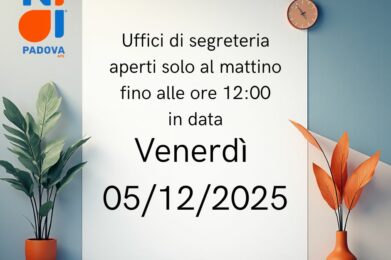 NOI Padova comunica che in data venerdì 5 dicembre 2025 gli uffici di segreteria rimarranno aperti soltanto al mattino fino alle ore 12:00. Lunedì 8 dicembre la segreteria rimarrà chiusa per festività dell’Immacolata e da martedì 9 dicembre Davide e Roberta torneranno disponibili ai consueti orari.