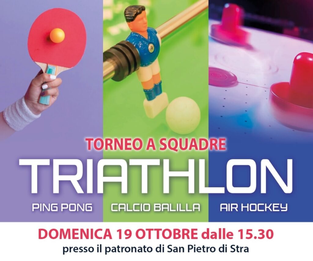 Il triathlon si terrà domenica 19 ottobre presso gli ambienti del centro parrocchiale, pronto per l’occasione ad accogliere famiglie e amici che si sfideranno con tre giochi: pin pong, air hockey e calcio balilla.